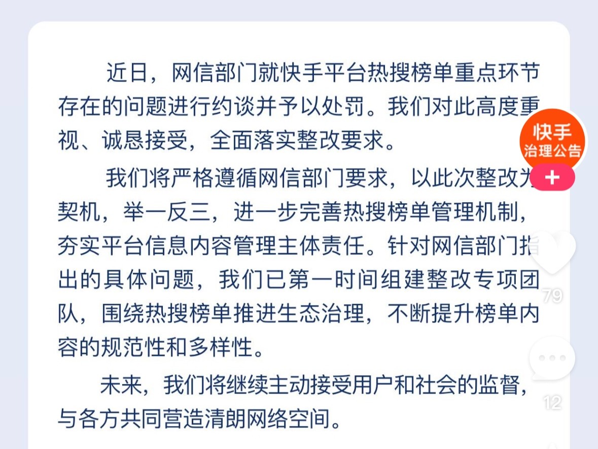 快手回应热搜问题被约谈:全面整改健全管理机制