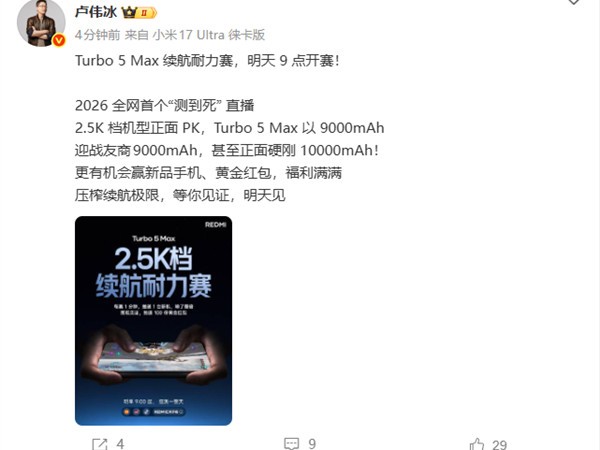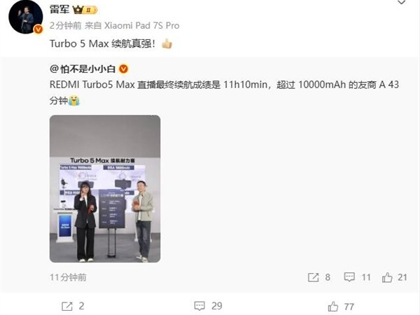 Redmi Turbo5 Max续航实测:9000mAh电池超长待机11小时10分