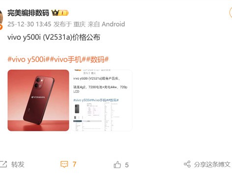 vivo Y500i发布:7200mAh电池+44W快充,1月16日开售