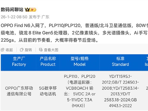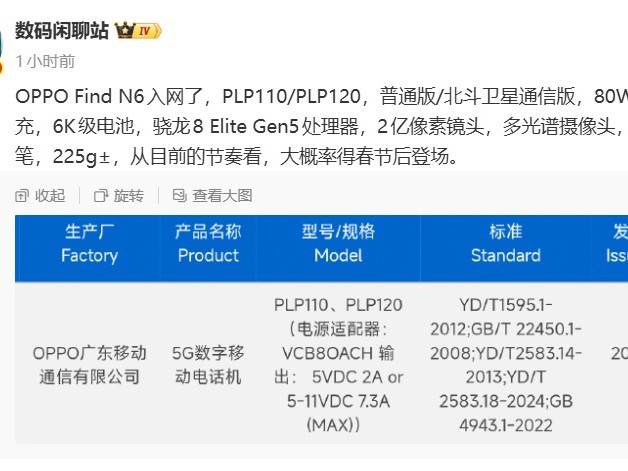OPPO Find N6入网:6000mAh双电芯+2亿像素+骁龙8 Elite,3月发布