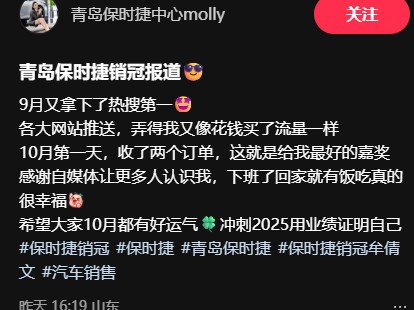 青岛保时捷销冠回应舆论:9月再夺榜首,10月首日已获两单