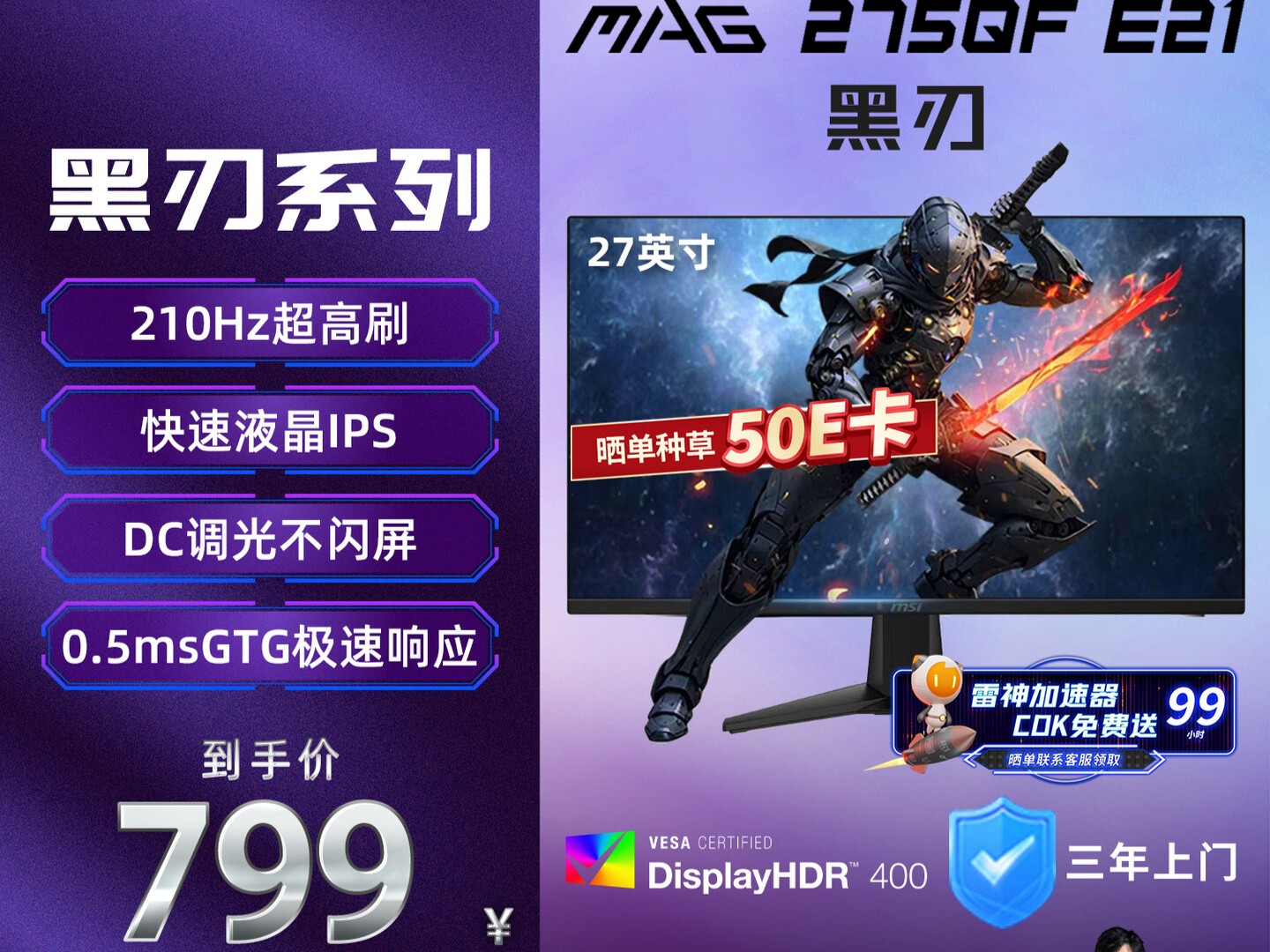 微星黑刃E21显示器年货节狂促:2K210Hz电竞小金刚,到手仅799元!