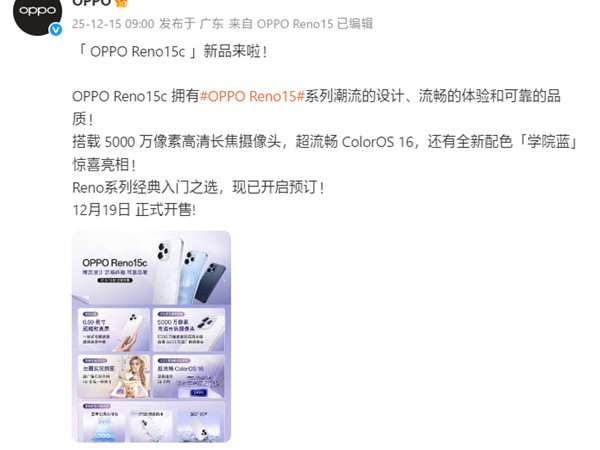 OPPO Reno15c发布:骁龙7加持,6500mAh电池,12月19日开售